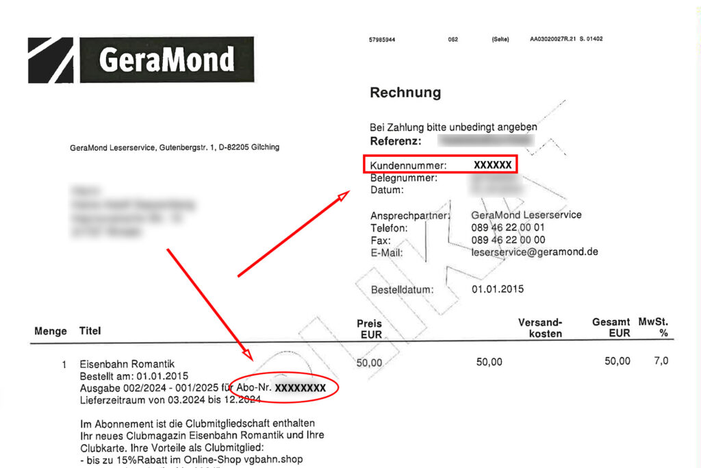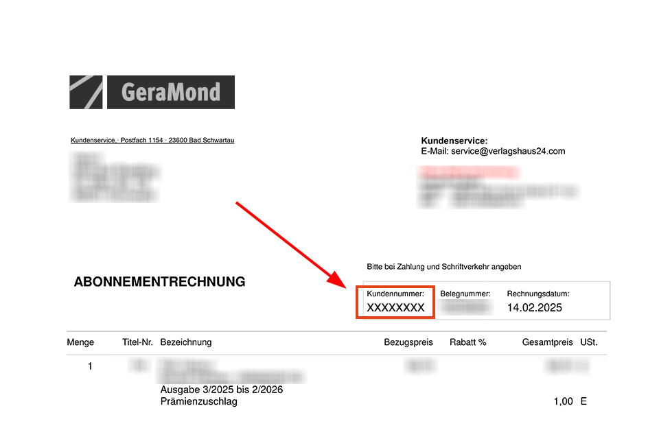 Auch auf der Abo-Rechnung finden Sie ebenfalls Ihre 8-Stelligen Abonnentennummer. Ihre Abonnentennummer finden Sie unterhalb der Lieferanschrift bei der Artikelauflistung.